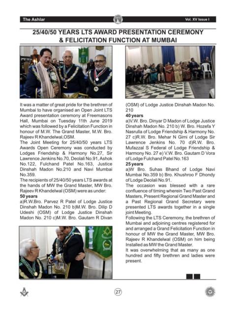 Dinshah Madon No. 210 b)M.W. Bro. Dilip D presented LTS awards together in a single