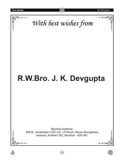 N A L G I O G E RAND LODGE The Ashlar R Vol. XV Issue I R.W.Bro. J. K. Devgupta Mumbai Address: 306-B, Janakdeep CHS Ltd, J.P.Raod, Seven Bungalows, Versova, Andheri (W), Mumbai - 400 061. 32