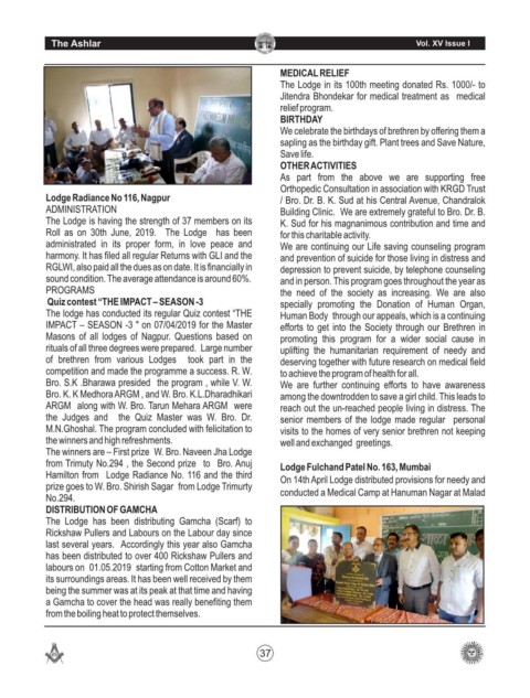 The Lodge is having the strength of 37 members on its K. Sud for his magnanimous contribution and time and