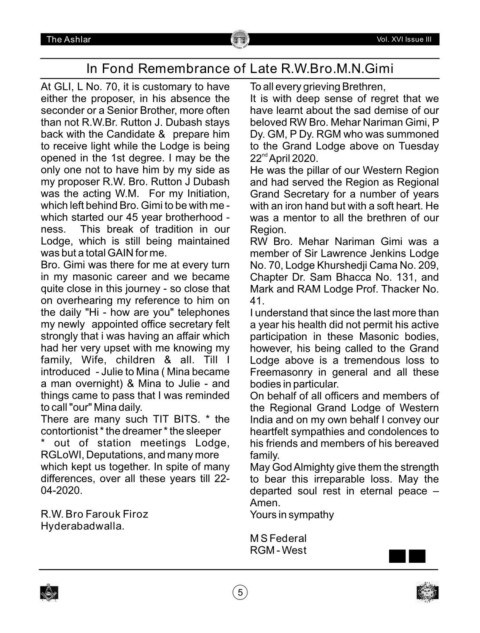 In Fond Remembrance of Late R.W.Bro.M.N.Gimi